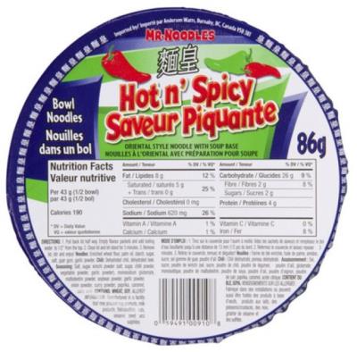 CN8989 : Mr. noodles CN8989 : Pasta, rice and noodles - Ramen - Hot & Spicy Ramen (bowl) MR. NOODLES,hot & Spicy RAMEN (BOWL),12 x 86G